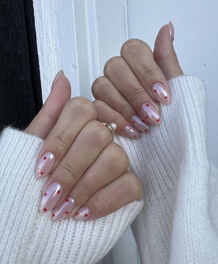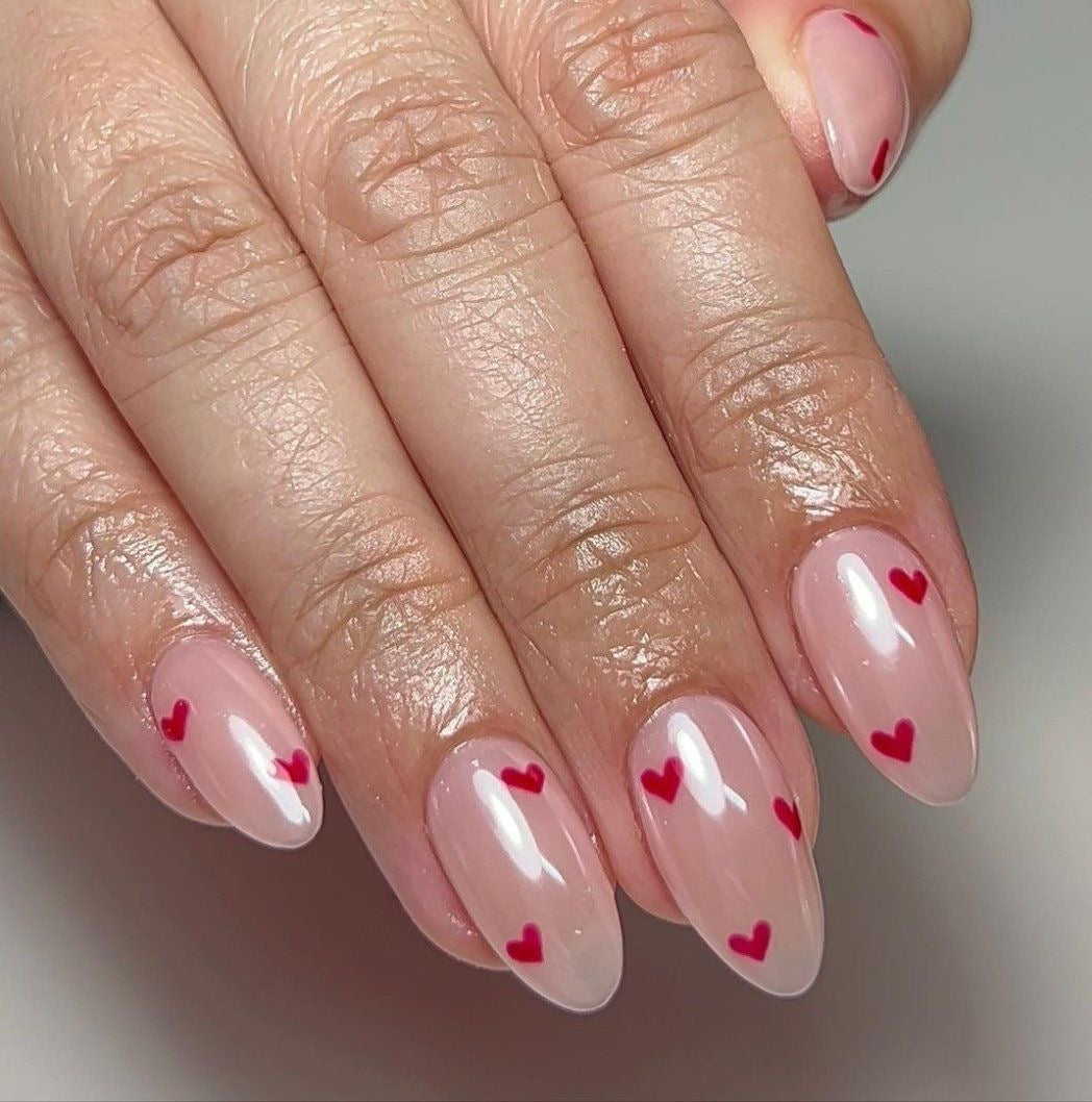 24 Pcs Blush Loves Tiny heart design Medium size Nails for Parties, Office Wear, Casual Wear and Daily Wear. These elegant Nails look so real to wear.